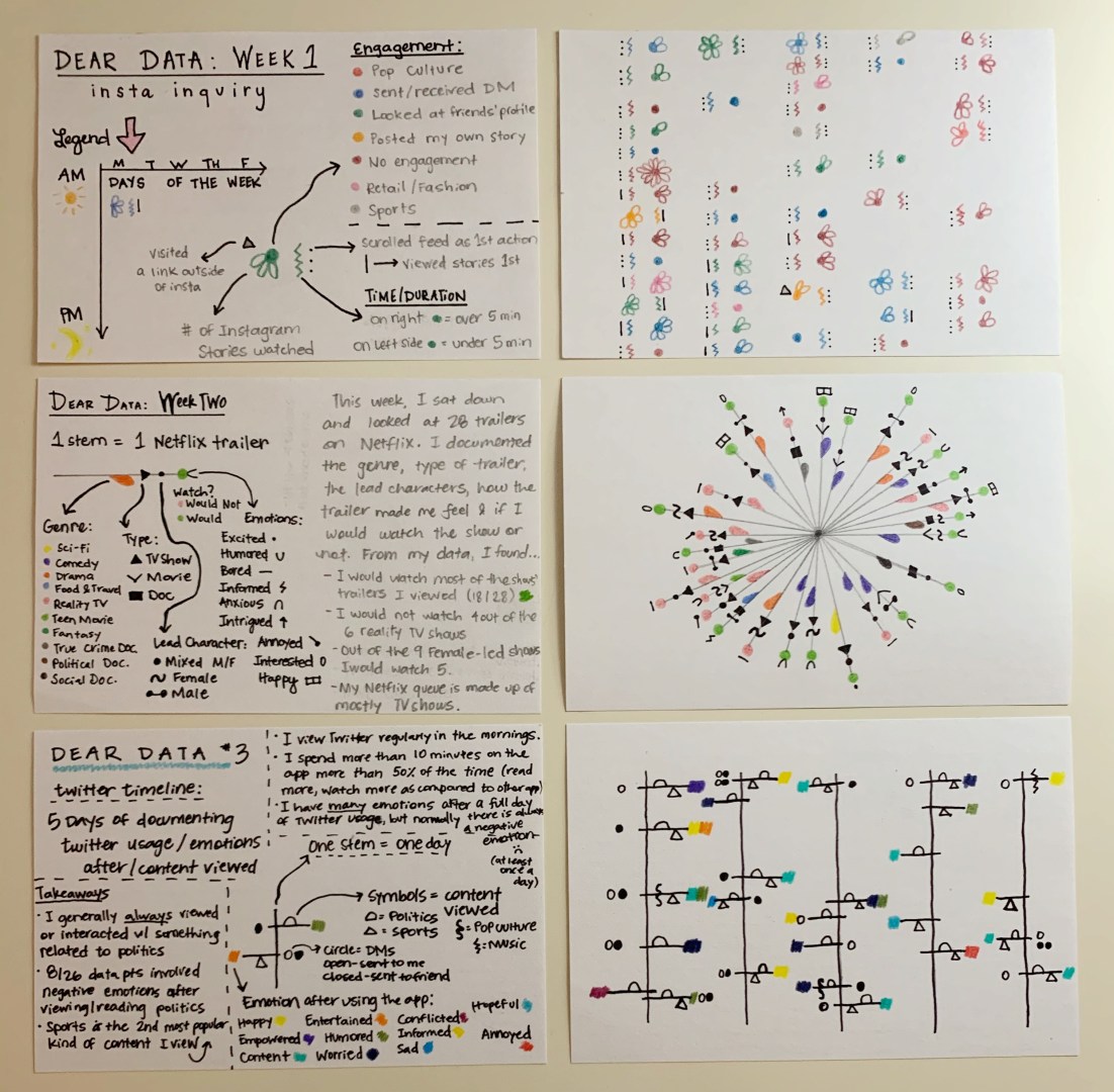 I really enjoyed these projects throughout the class. I am a visual learner and like to doodle and draw things out to help understand topics and information better. Throughout the three weeks, I learned that I really analyze what actions I am taking when I am collecting data. For example, while charting and noting my social media use, I was very aware with how much time I was spending on Twitter and Instagram. I also learned that I am interested in what my emotional response is to data collection, as I used emotions in all of my data drawings.