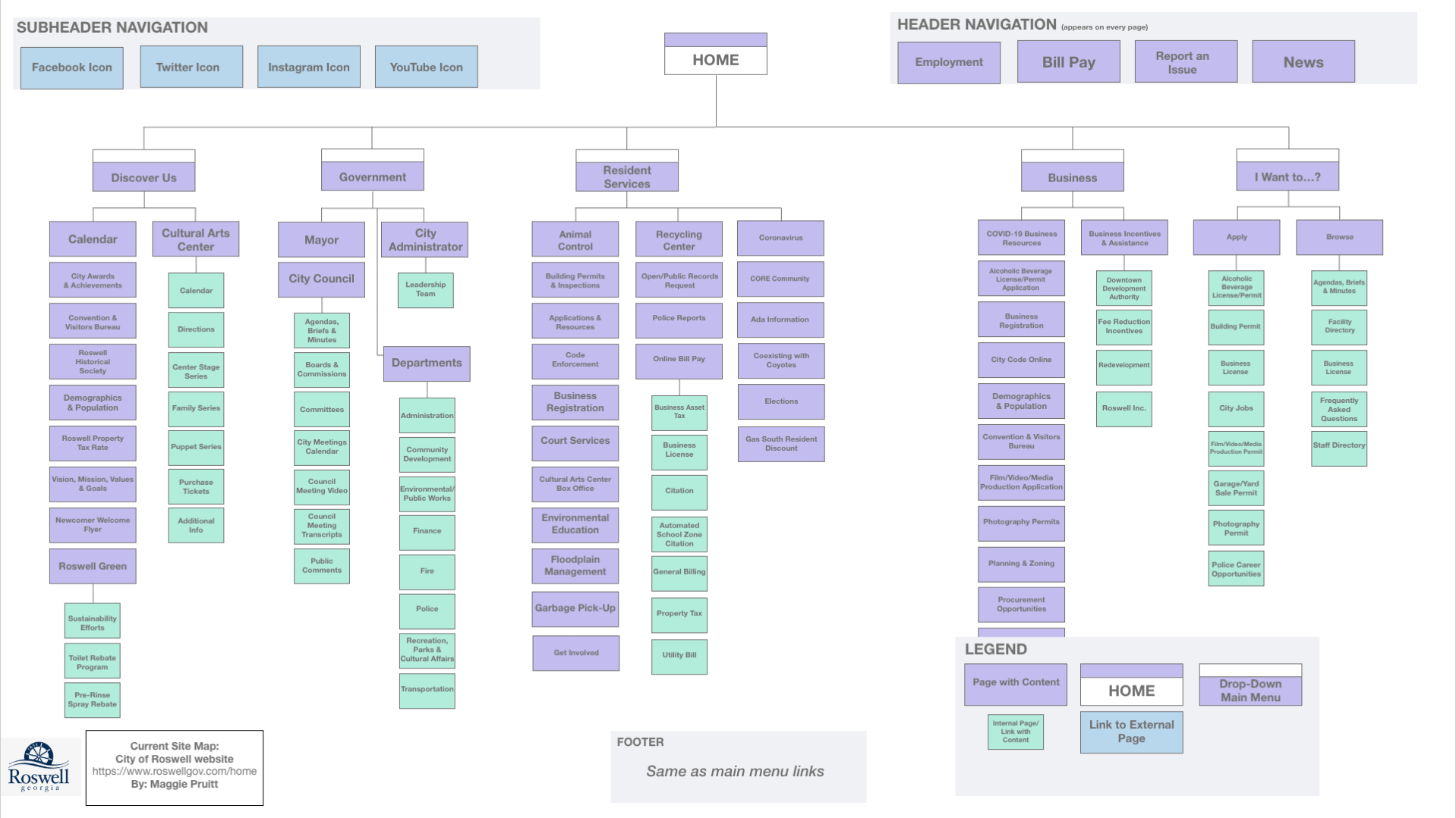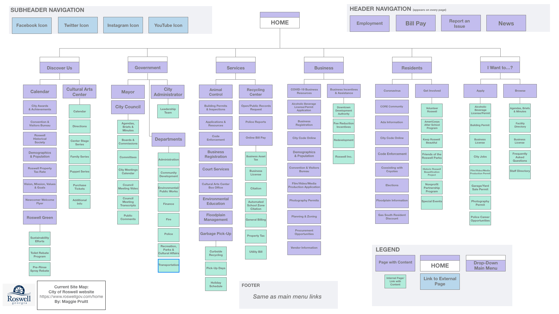 First, I created a site map that represented the current website and its content (shown above). The Roswell website is very extensive and detailed. There are a lot of submenus and pages, so it took me a long time to go through them. (I did not include every page/link in the site map.)