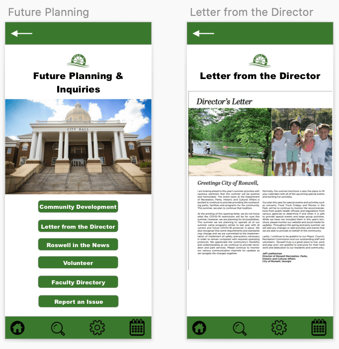 After testing participants on navigating the Recreation in Roswell app, I then moved on to the final stage which included the designing of high-fidelity prototypes. High-fidelity prototypes are designed to appear and function as close to the final product as possible (Babich, 2017). These high-fidelity prototypes are mainly used for more testing or as a presentation for stakeholders.